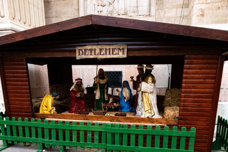 Standbeeld van Franz Jozef, waarvan er veel in de stad staan. Boven midden: kerststal bij ingang parlementsgebouw;